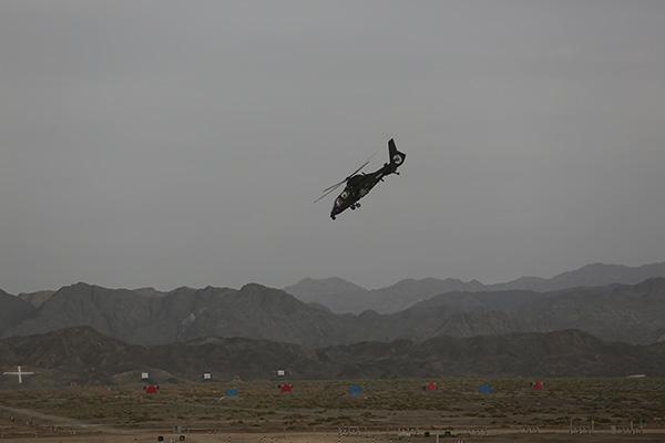 武装直升机加速俯冲,随即拉起,180度掉头后再度俯冲。澎湃新闻记者 谢匡时 图