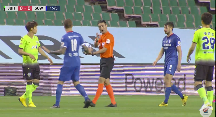 在看到全北现代没有得益之后,主裁判吹停了比赛。水原三星球员塔加特摊手示意“我没犯规啊”,主裁判金侑成作出一个手势,示意是自己阻挡了全北现代的进攻,所以吹停比赛,判罚坠球。