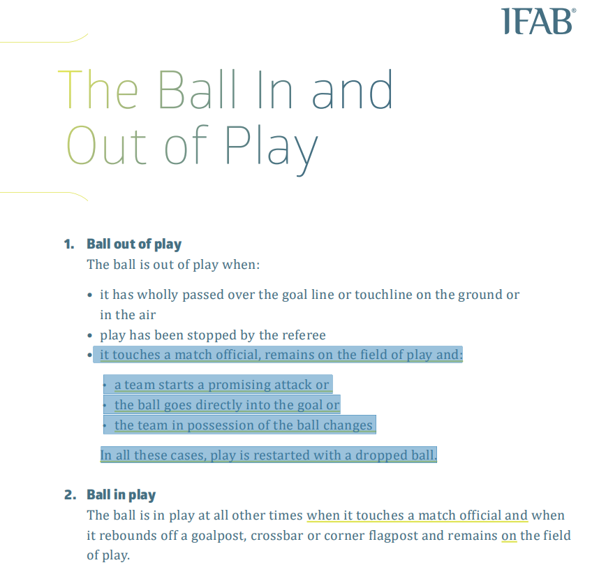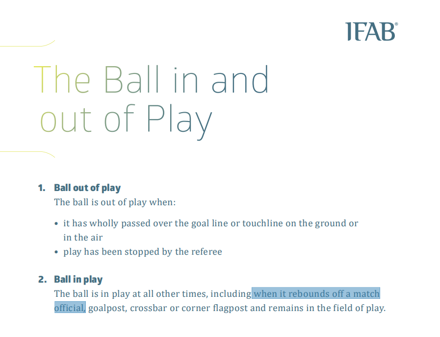 18/19足球竞赛规则明确指出,包括球从比赛官员、球门柱、横梁或角旗杆弹回,且仍在比赛场地内,都视为比赛进行中。