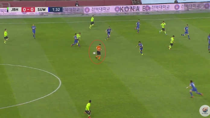 上半场第2分钟,就出现罕见一幕:全北现代在左路发起反击,不过左路传中球打在了主裁判金侑成的身上,没能成功传过去。