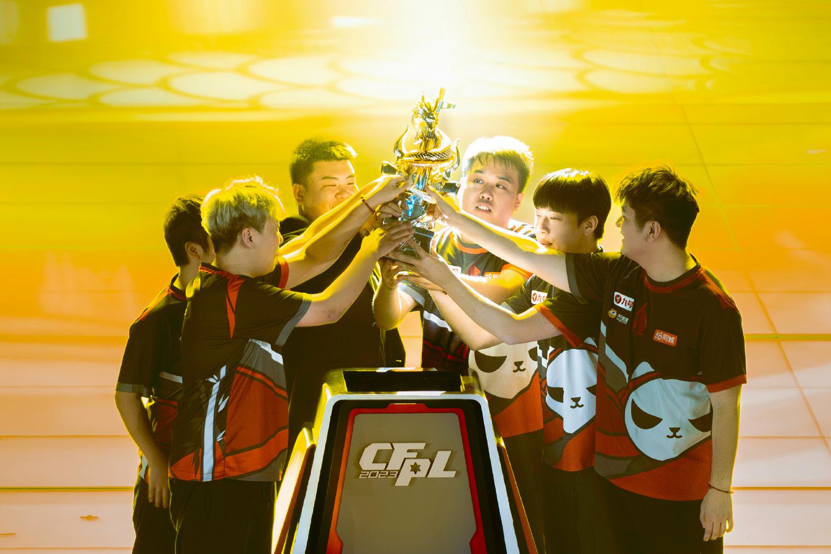 成都AG在穿越火线CFPLS22总决赛中夺冠,刘家桢(左三)与队员们庆祝(2023年8月5日摄)。 新华社发