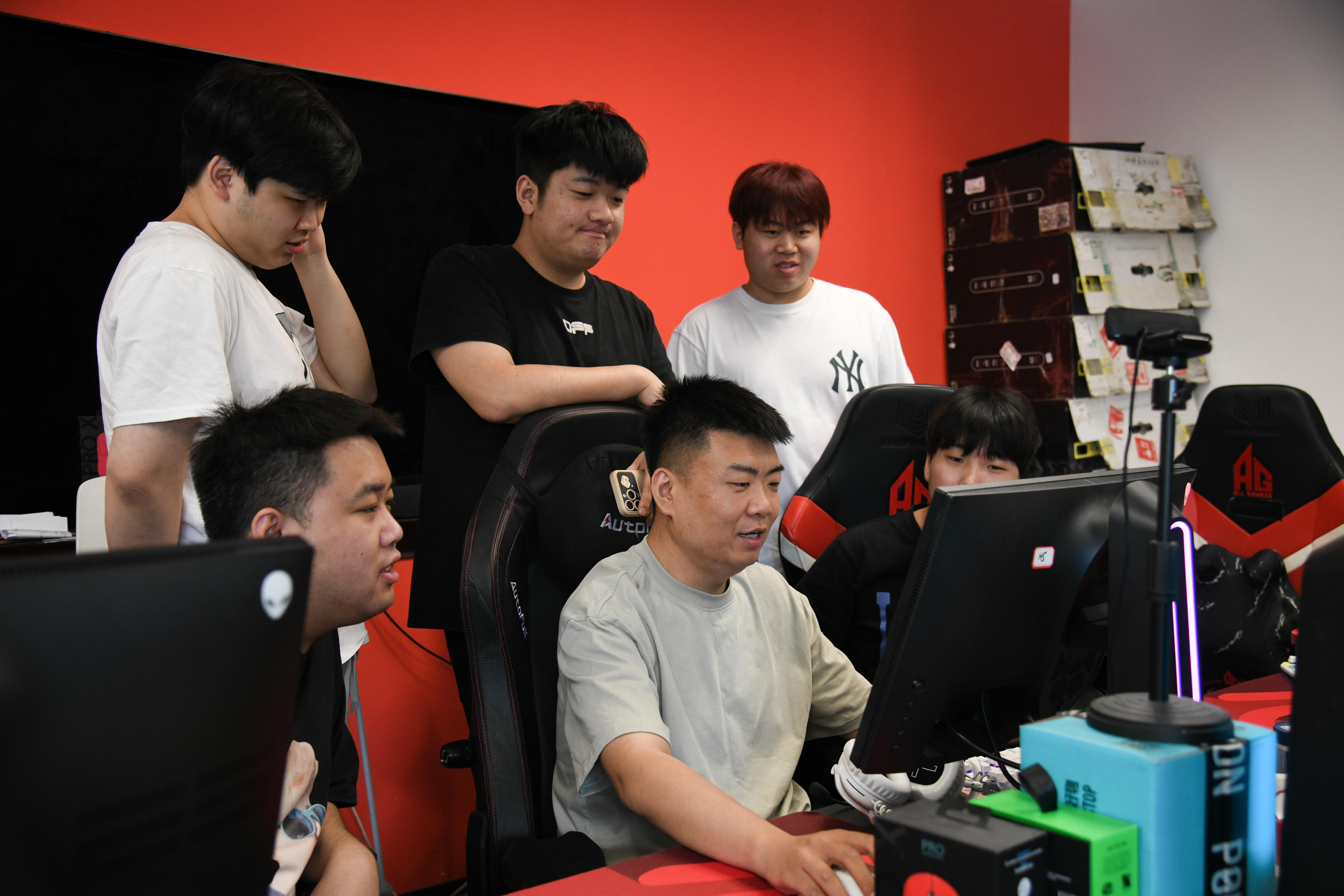 5月9日,在成都AG电子竞技俱乐部训练室,刘家桢(前中)在训练结束后与团队成员一起复盘。 新华社记者 胥冰洁 摄