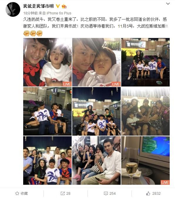 8月24日晚9点13分,“金牌拳王”邹市明在个人微博发布最新动态,瞬间引爆了粉丝圈。他如是写到,“久违的战斗,我又卷土重来了,比之前的不同,我多了一批志同道合的伙伴,感谢家人和团队,我们并肩作战!庆功酒等待着我们,11月5号,大战拉斯维加斯!”通过字里行间,能深切感到邹市明对于下一战的渴望,而万千网民也纷纷给拳王加油打气,预祝他再获胜利!