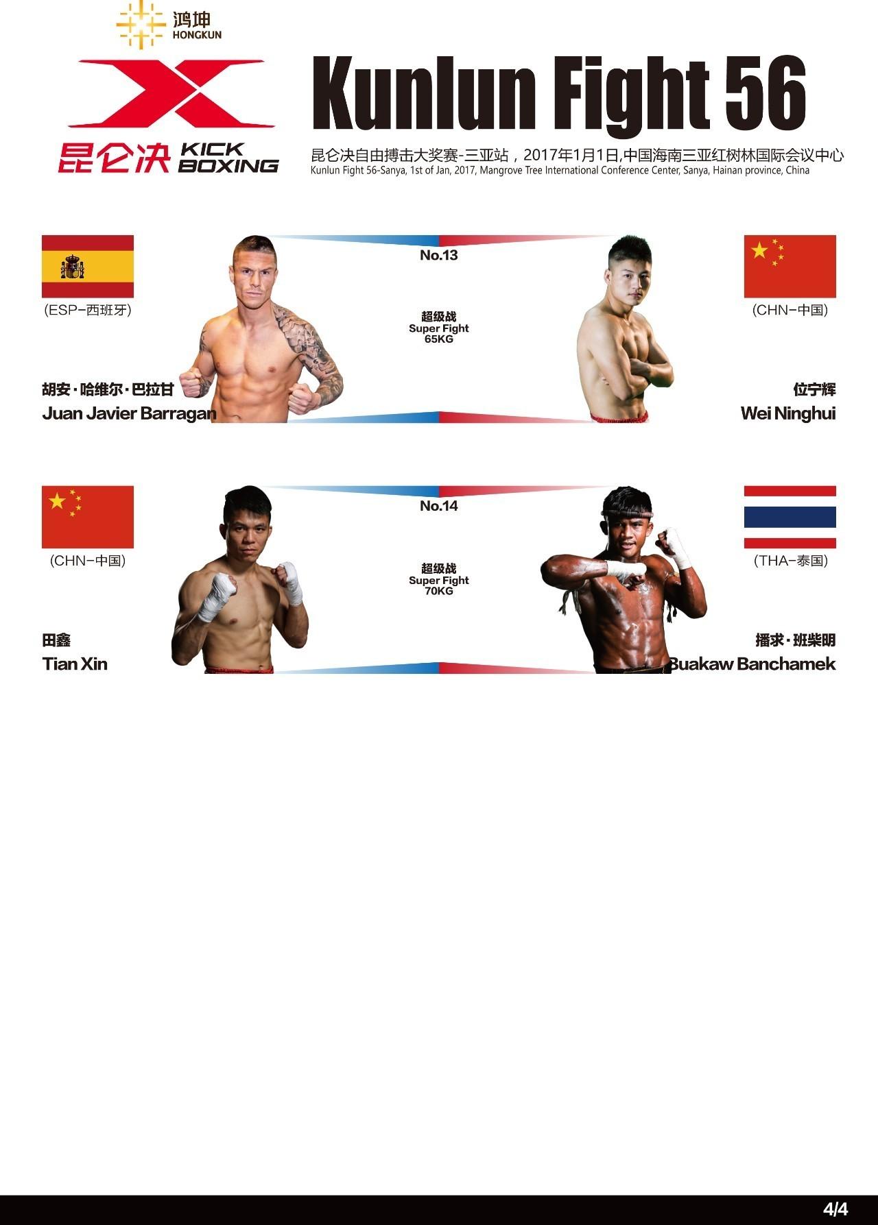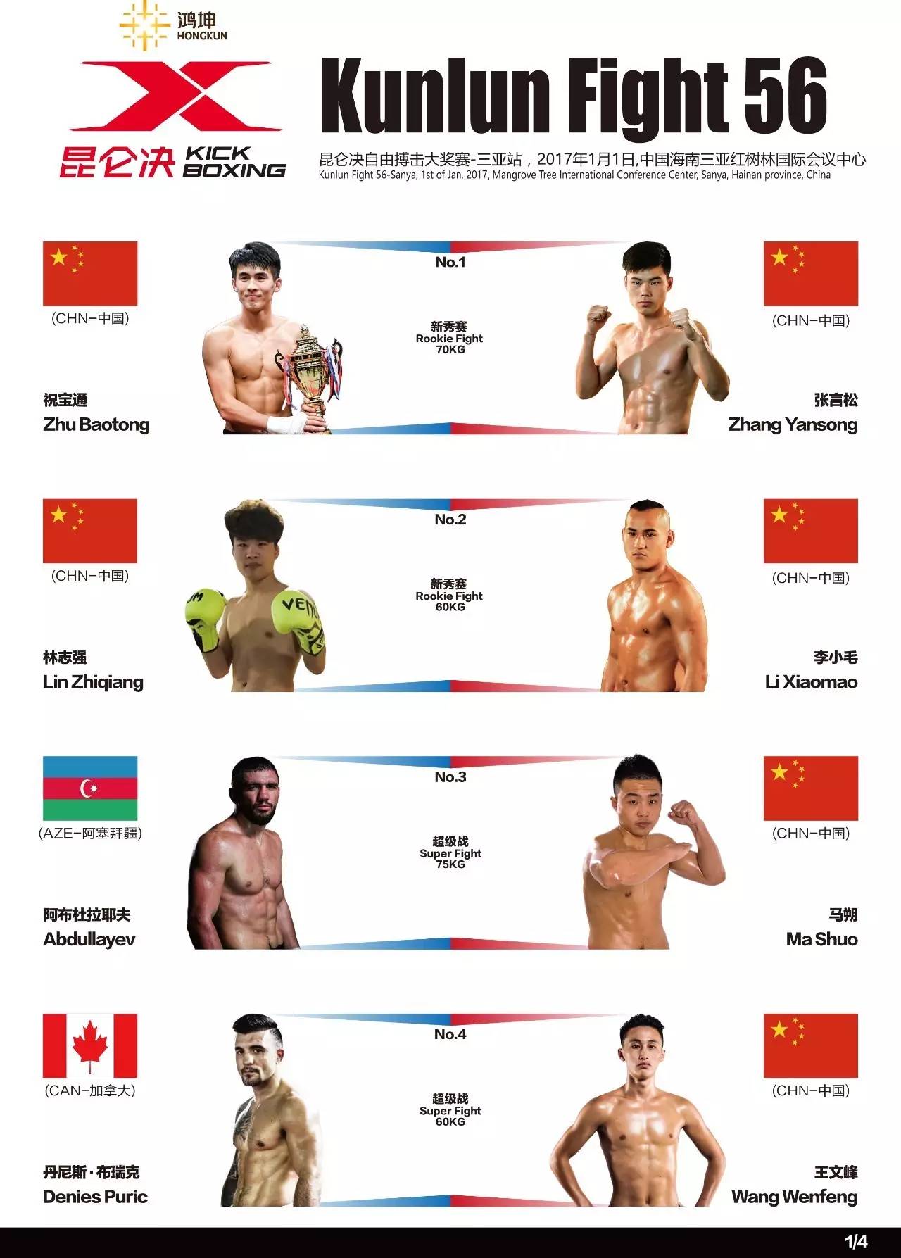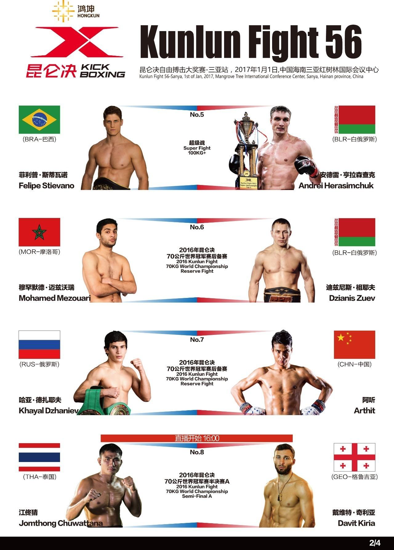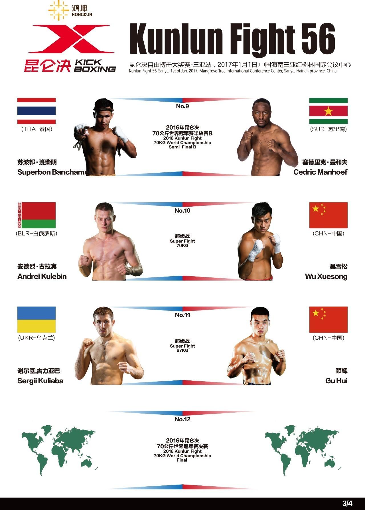 2017年1月1日世界顶级站立格斗赛事昆仑决将在三亚上演一场格斗盛宴。本次比赛是昆仑决2016年全年的收官之战。在美丽的三亚湾红树林度假世界,鸿坤昆仑决集结了来自13个国家的顶尖拳手精心打造了本年度最强阵容。