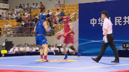 第二局比赛开始,依旧由李梁率先发动攻势,他连用几次鞭腿技术抢得数分,但付高峰依旧棋高一着,以力卸力,将李梁摔倒在地。