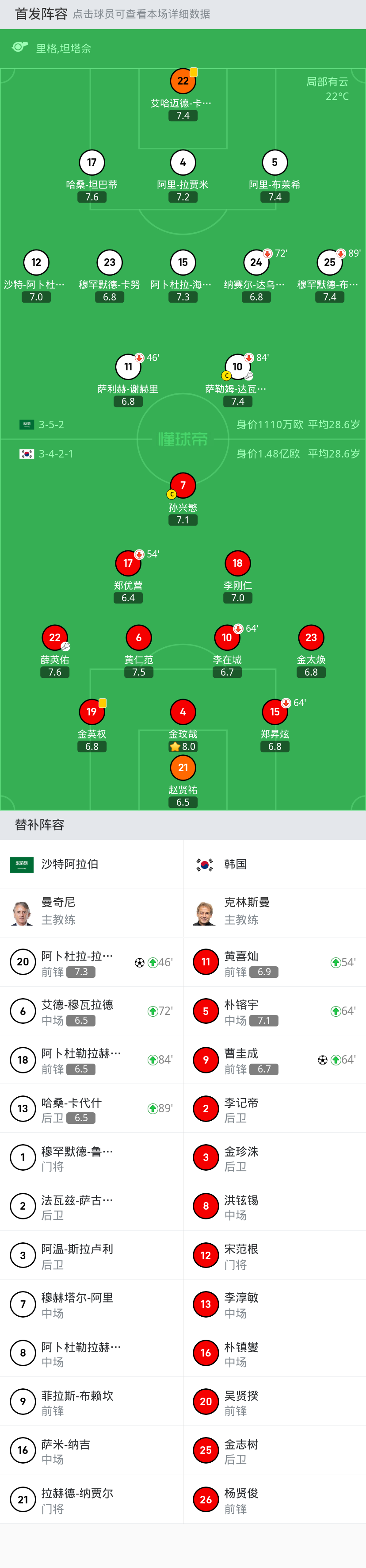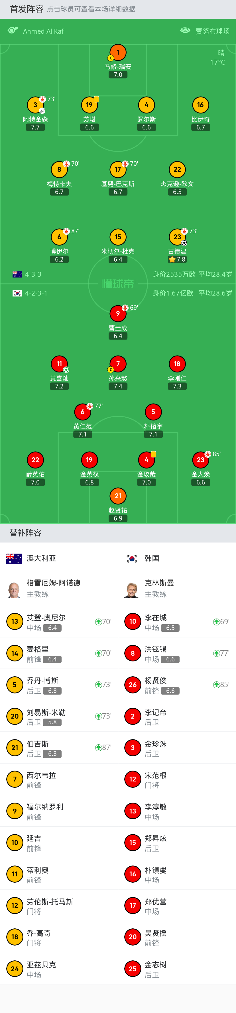 韩国首发:21-赵贤祐、4-金玟哉、15-郑昇炫(65'5-朴镕宇)、19-金英权、22-薛英佑、23-金太焕、6-黄仁范、10-李在城(65'9-曹圭成)、17-郑优泳(55'11-黄喜灿)、18-李刚仁、7-孙兴慜