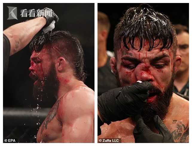 27岁的迈克·佩里(左),比赛中鼻子被打成型(右)