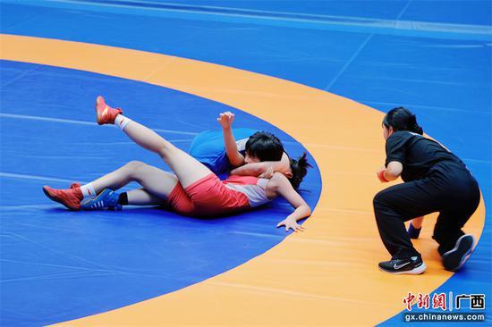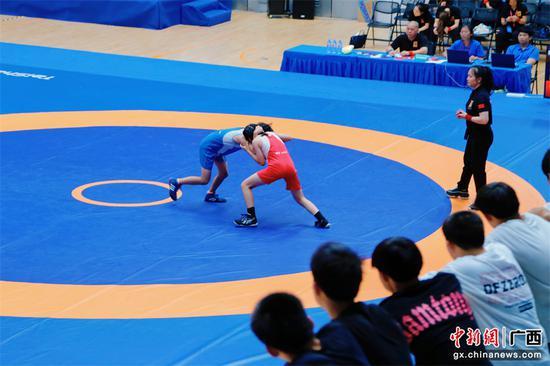 中新网广西新闻7月11日电 7月8日-11日,2024年广西青少年摔跤锦标赛在广西民族大学思源湖校区体育馆举行。来自全区的17支代表队600名运动员齐聚一堂,共同演绎了一场场精彩的摔跤对决。