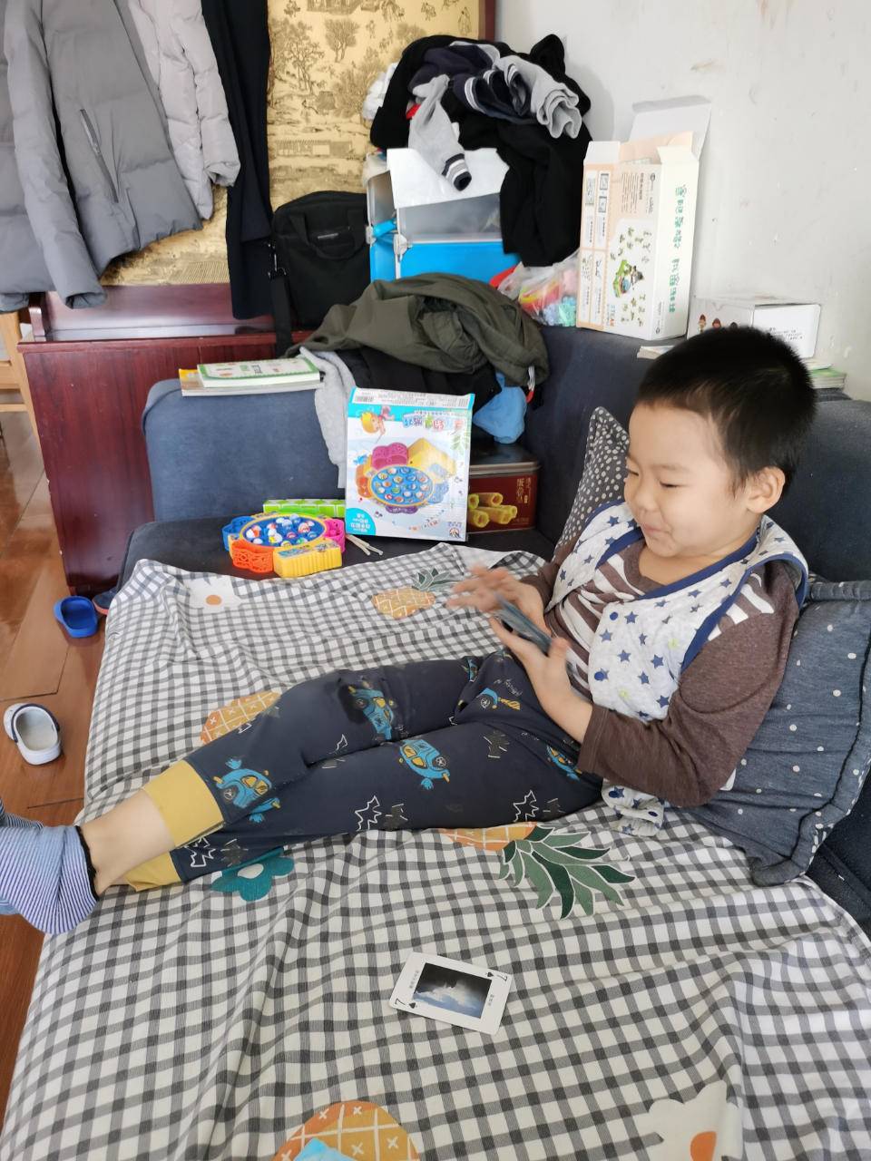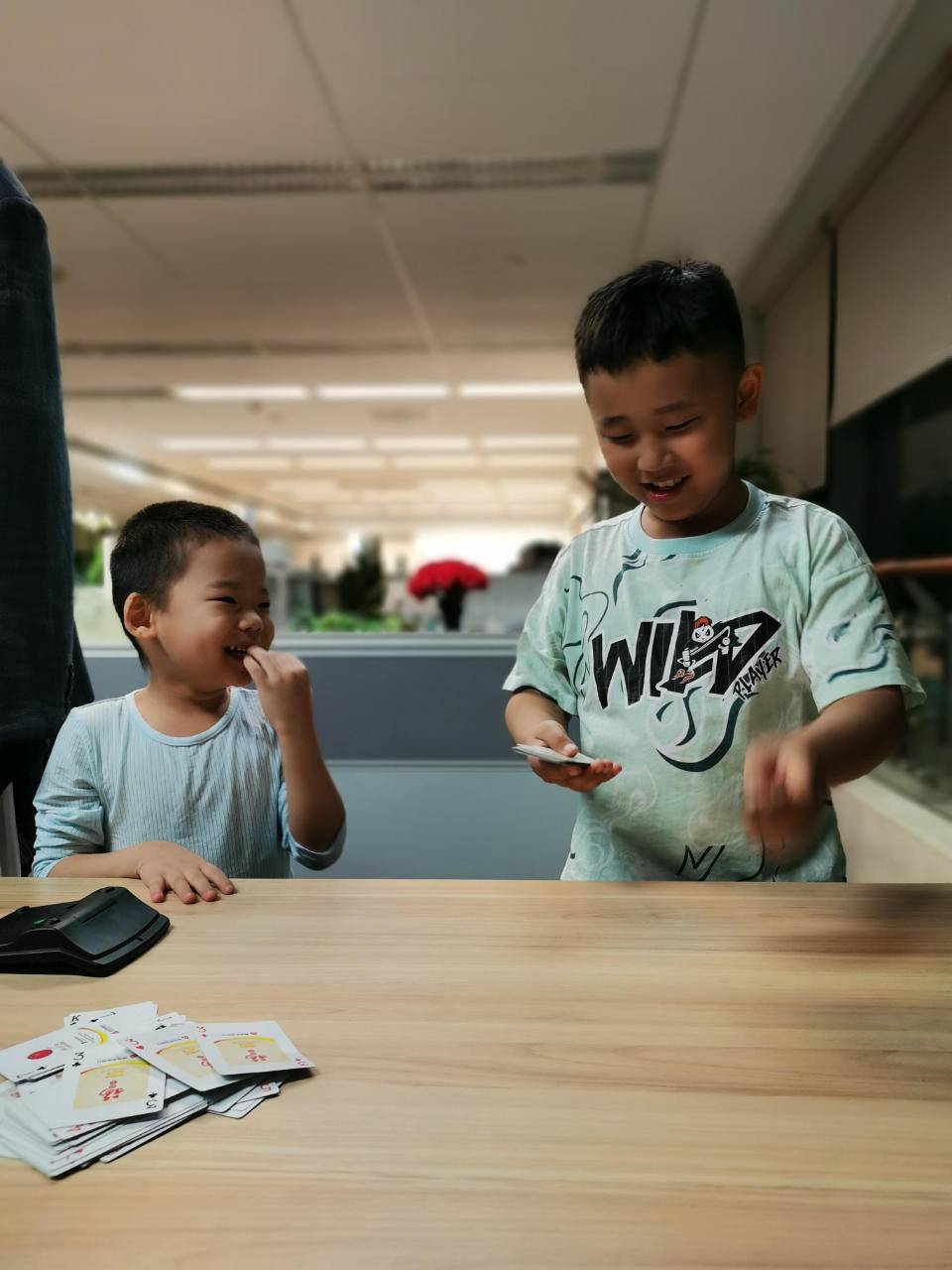 能和孩子一起玩棋牌,我也乐在其中,光是扑克我们就有排火车、抽王八、五十凯、变色龙、花色接龙、凑个十、争上游、手把一、斗地主等不少玩法。现在弟弟最爱玩的是八十分,说起来这也是我的一个家庭梦想——“四个家人一起打八十分”——在他5岁半时照进了现实。
