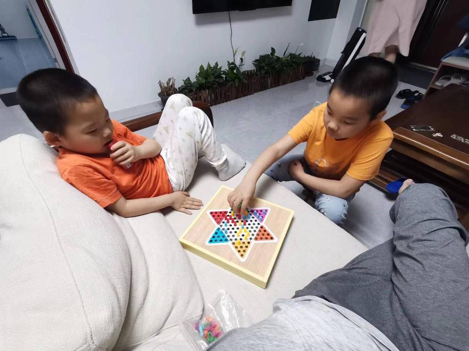 哥哥上幼儿园的时候,买过一套跳棋、象棋、飞行棋等多合一的棋盘,但当时弟弟才一两岁,不会下棋又总想参与,最终搞得棋子都不全了,但也先后掌握了蛇棋、飞行棋、五子棋这类简易玩法。