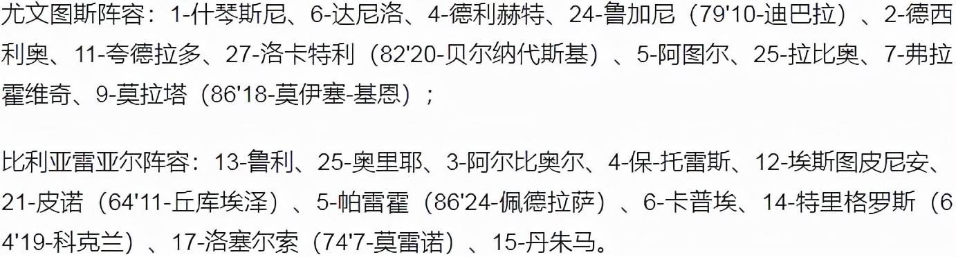 第81分钟,尤文图斯前场将球吊向禁区左侧,莫拉塔左脚小角度垫射,皮球被鲁利得到。第85分钟,黄潜再入一球,右侧角球开到门前,前点的奥利耶头球摆渡,后点的保-托雷斯推射破门,比利亚雷亚尔2-0领先尤文图斯。