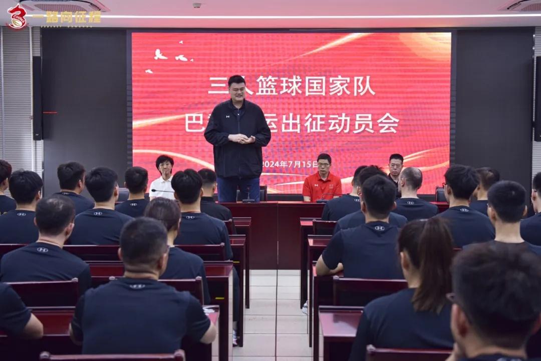 据新华社7月15日报道,中国三人篮球国家队在北京体育大学二七厂训练基地举行出征动员会,中国篮球协会主席姚明前来送行并做临行前的动员。