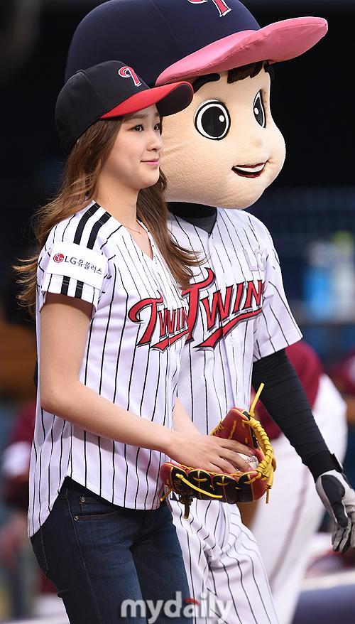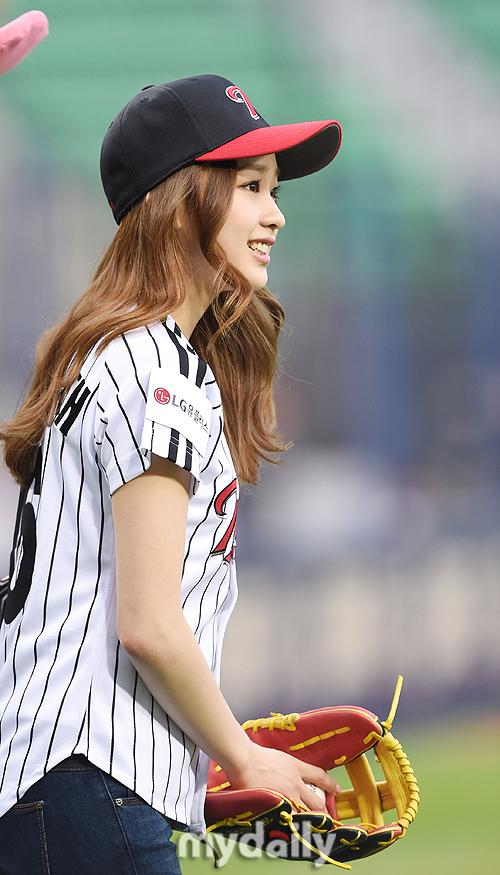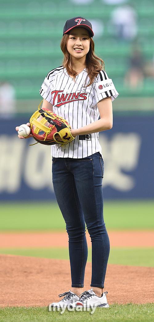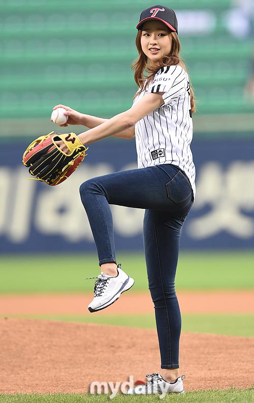 9月6日下午,韩国艺术体操运动员孙妍在来到首尔某棒球场,为在此举行的职业棒球比赛开球。