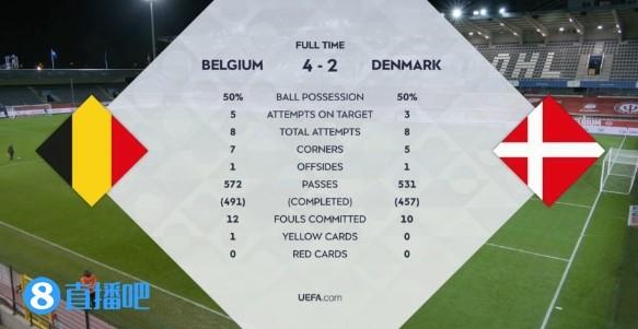 全场战罢,最终,比利时4-2丹麦。