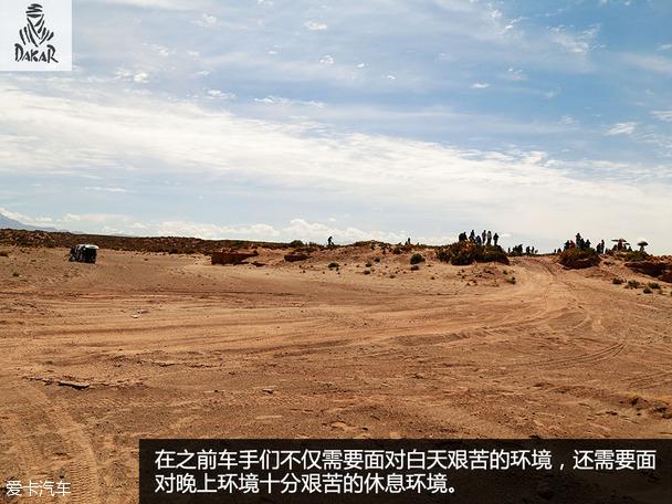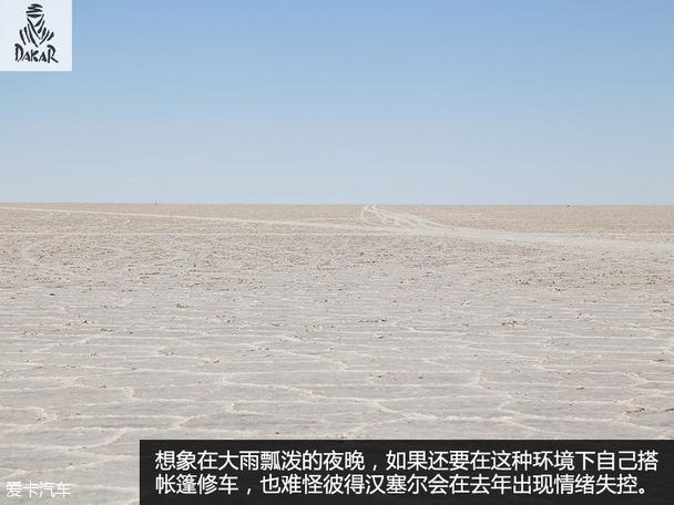 但是如果你认为这是达喀尔组委会的一贯传统,那将是大错特错的。如果将时间转到了10年之前,车手来到了这样的一块休息区域,相信我车手绝对会认为是自己开错了方向。远的不说,仅仅在去年的达喀尔玻利维亚赛段的乌尤尼,由于大暴雨的侵袭,车手们就必须面对白天赛车之后,晚上自己在盐湖区域搭帐篷修车的窘境。这也难怪作为达喀尔十年老将的彼得汉塞尔,会在这样的环境下出现了情绪失控的情况。