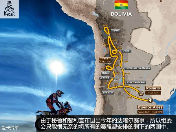 但是在今年的赛事中,由于厄尔尼诺现象等等自然因素的影响。秘鲁和智利两国自己国内自然灾害频发,已经无暇在估计达喀尔赛事,进而宣布放弃举报达喀尔赛事。所以本次达喀尔组委会,只能选择将所有的赛事都放进阿根廷、玻利维亚两国境内。