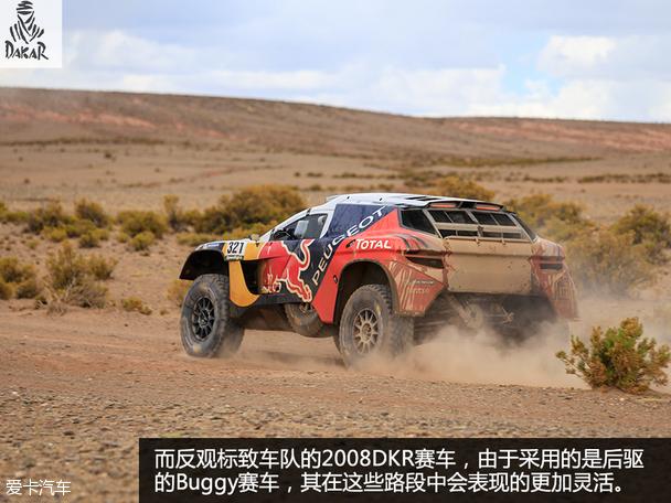 这么看来,在充斥的大量砂石道路的今年达喀尔赛事上,车辆的四驱系统也变得不是那么优势明显。虽然这点优势并不足以成就标致车队的改朝换代,但是从前几个赛段中,标致2008DKR赛车神乎其神的表现上,我们确实能够找到些由于赛段设计,对比赛最终成绩所造成的影响。