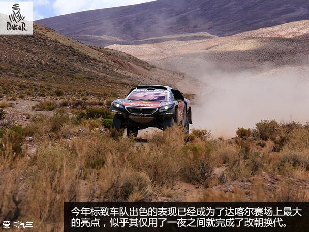 如果说本届达喀尔赛事从赛道的难度上来说并没有那么大的吸引力的话,那么本次第二度参赛的标致车队,将成为了最大的看点。从已经结束了本次赛事上来看,彼得汉塞尔凭借着比赛后程的稳定发挥,斩获了汽车组的全场冠军。并且除此之外,标致车队在赛事开始时的表现更是十分惊人,标致车队的四台赛车甚至一度包揽了前四名。对于标致这个重返达喀尔赛事仅仅两年的车队来说,甚至有些不可思议,似乎改朝换代仅仅在一夜之间。