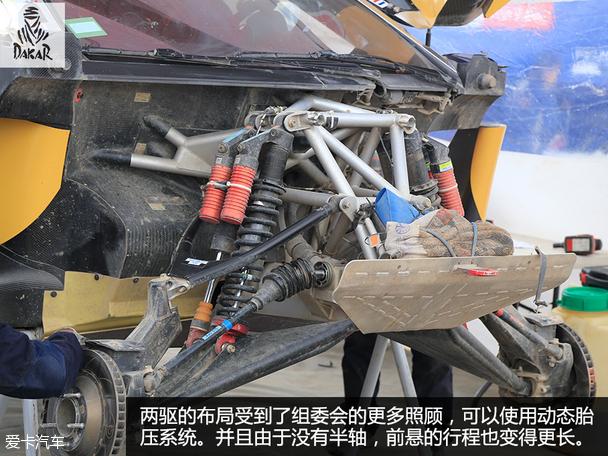 采用这样的布局也并非是一件不可思议的事情,毕竟Buggy赛车在达喀尔赛场上也曾经获得过相当不错的战绩。并且,根据达喀尔组委会的赛事规定来看,赛规对于两驱车型也是照顾有佳,允许两驱车辆安装动态胎压系统,车手可以根据路况的不同,通过车内的按键来实时控制轮胎胎压,这样一来将会节省不少的时间。