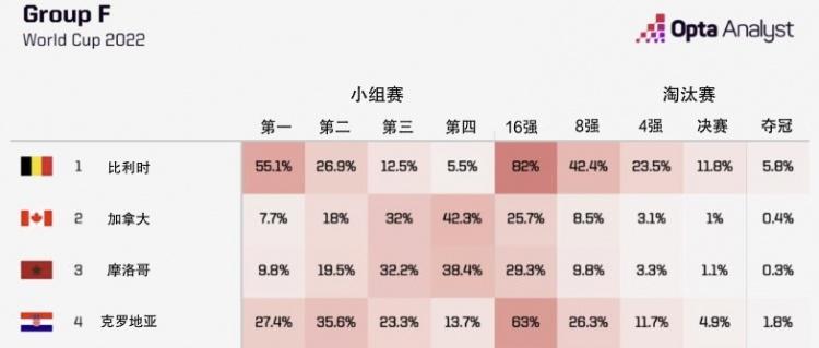 Opta数据显示,F组四支球队中,比利时的小组出线概率为82%,加拿大为25.7%,摩洛哥为29.3%,克罗地亚为63%,此外,比利时有55.1%的几率获得小组头名。