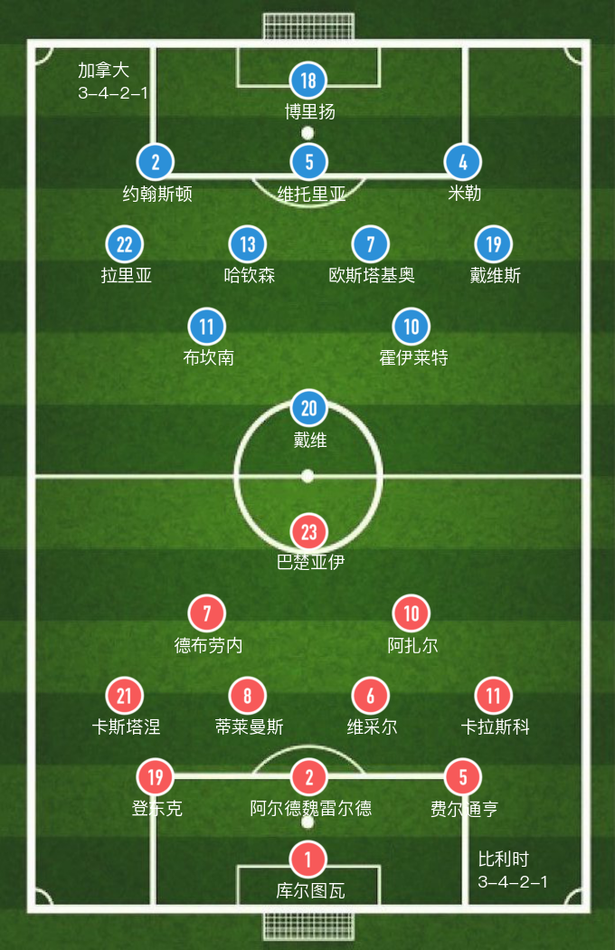 拥有德布劳内、阿扎尔等人的比利时队是上届世界杯季军,但本场比赛表现更加主动的是时隔36年重返世界杯决赛圈的加拿大队。