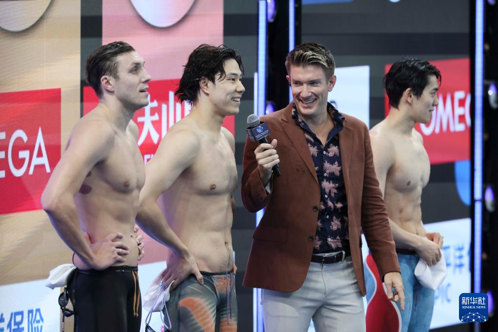 10月19日,中国选手覃海洋(左二)在夺冠后发言。