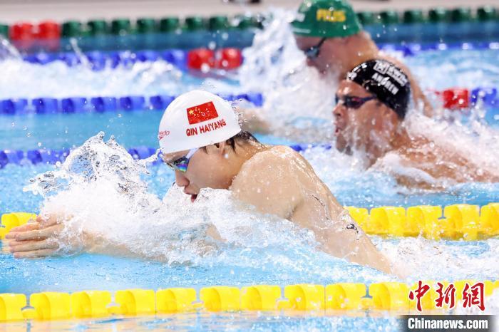 10月19日晚,2024年世界泳联游泳世界杯(上海站)的比赛在东方体育中心游泳馆举行。中国选手覃海洋(右一)在男子50米蛙泳的决赛中,以25秒38的成绩夺得冠军。中新社记者 汤彦俊 摄
