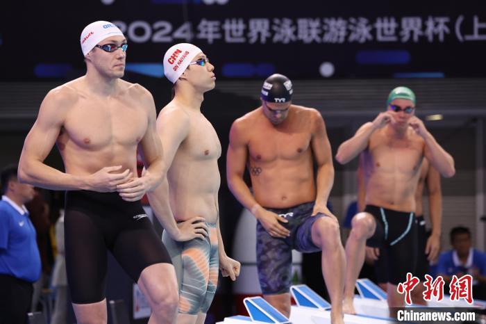 10月19日晚,2024年世界泳联游泳世界杯(上海站)的比赛在东方体育中心游泳馆举行。中国选手覃海洋(左二)在男子50米蛙泳的决赛中,以25秒38的成绩夺得冠军。中新社记者 汤彦俊 摄