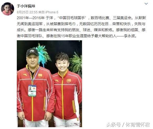 在里约之后的8月26日,于洋曾发了微博宣布退役(现已删除),写道:“感谢我的祖国、感谢中国羽毛球队、感谢在我15年职业生涯里给予最大帮助的人——李永波。”