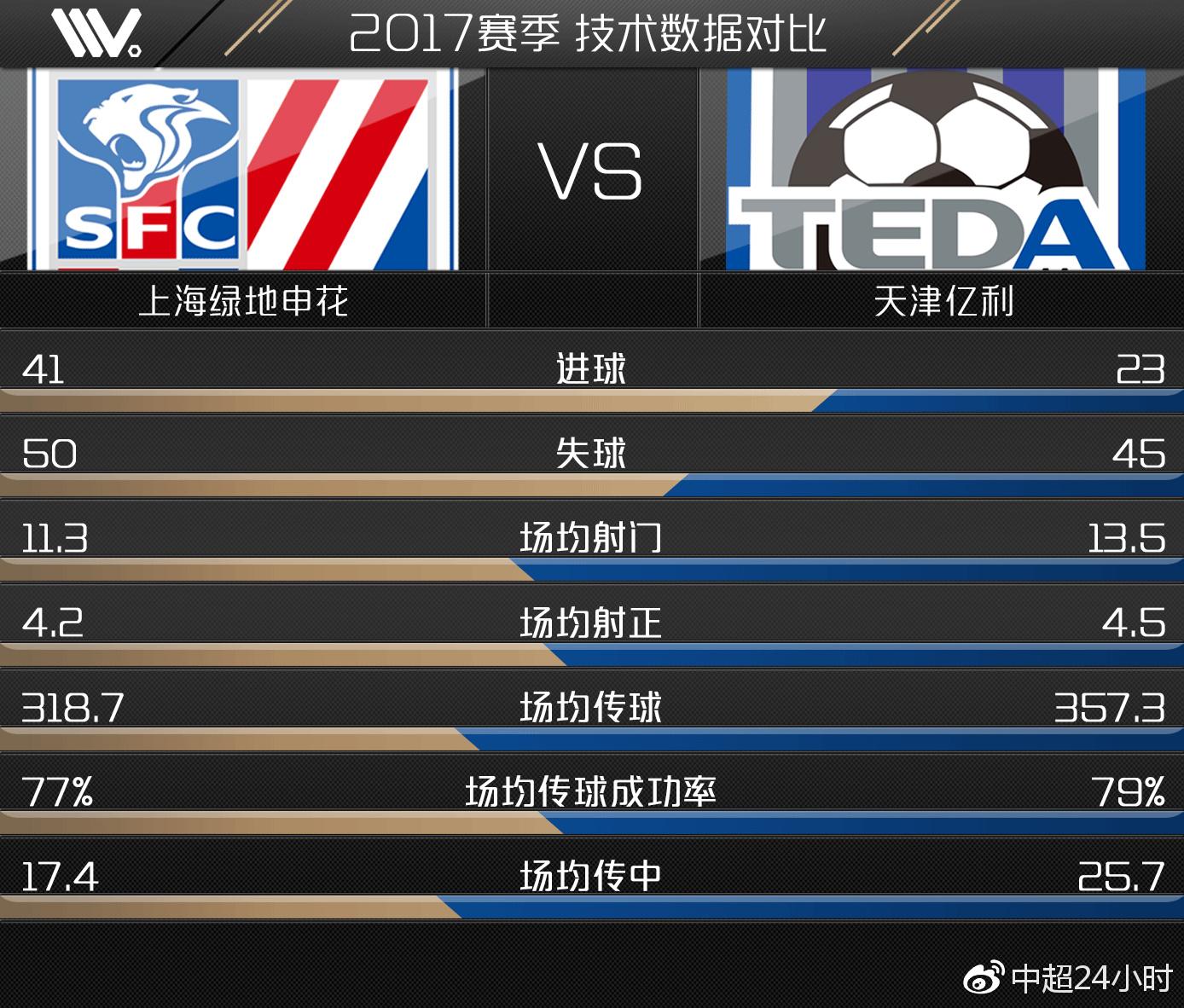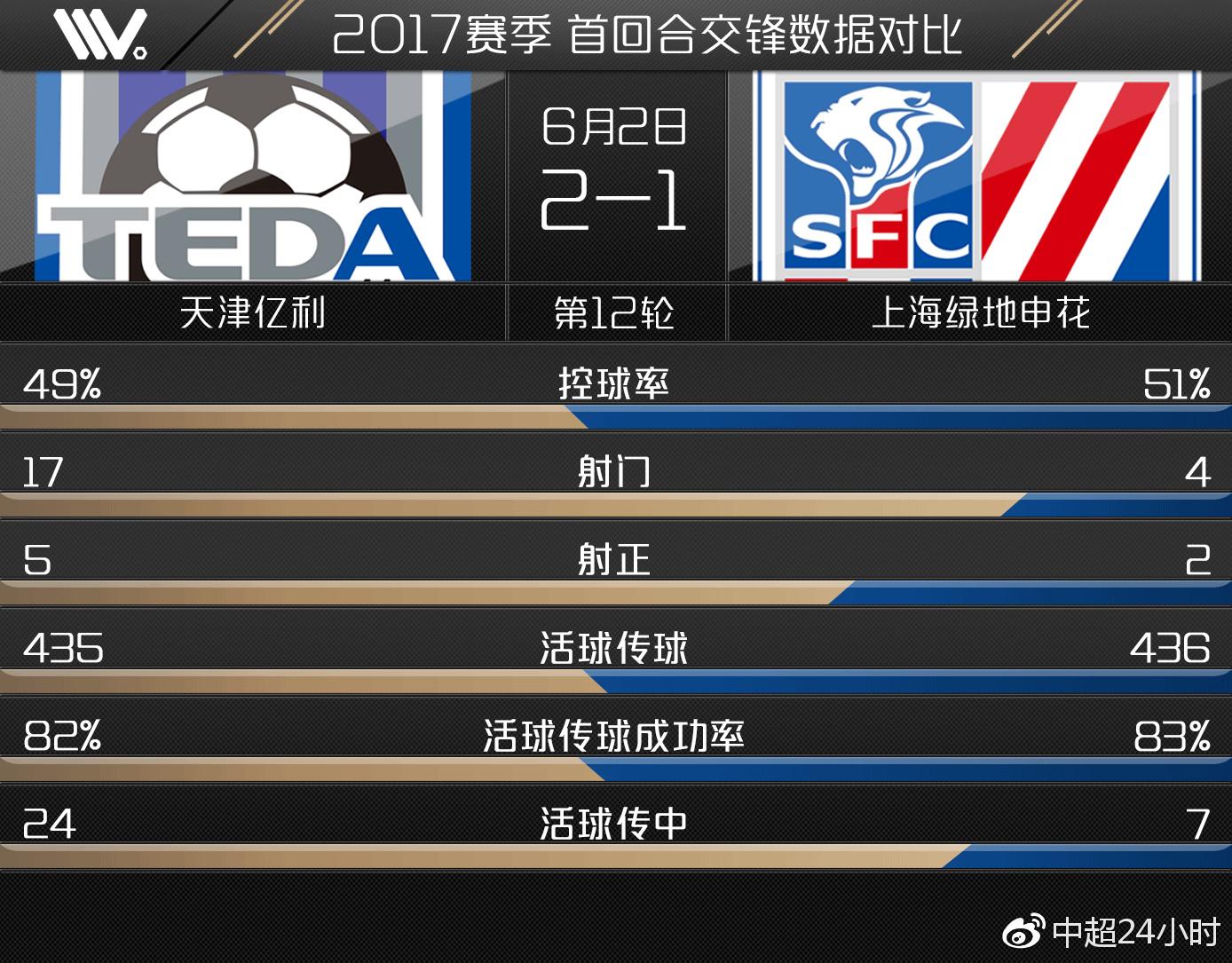 2017年6月2日,中超联赛第12轮,两队进行了本赛季联赛的首回合较量。最终坐镇主场的天津亿利队凭借比赛尾声阶段伊德耶的绝杀进球,以2:1的比分战胜了上海绿地申花队。 通过这场比赛的技术数据对比,我们发现两队在控球率与活球传球次数等传控数据均相差不大,这说明这场比赛两队基本处在一个均衡的态势。但天津亿利队在几乎相等的控球机会下完成17次射门,上海绿地申花队则仅有4次。此外天津亿利队边路传中达24次,同样是上海绿地申花队的3倍之多。这说明天津亿利队在这场比赛中在进攻方面占据了非常明显的主动。然而较差的射门质量却影响了天津亿利队的比赛进程。全场17次射门仅5次射正,这也使得天津亿利队在进攻明显压制对手的情况下,直到比赛第89分钟才由伊德耶完成绝杀。