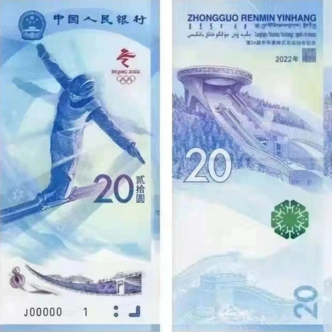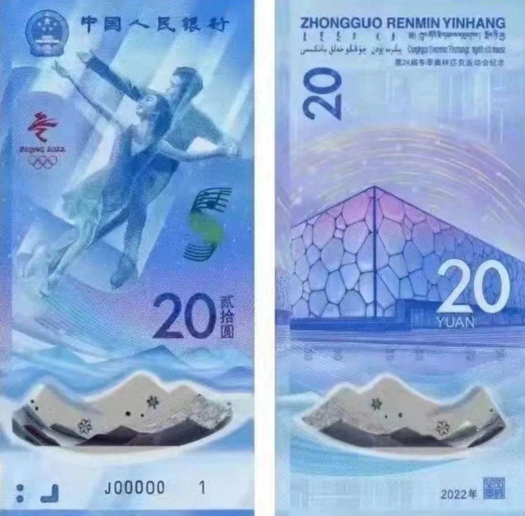 2021年12月21日,中国人民银行发行2张第24届冬奥会纪念钞——冰上运动项目纪念钞(塑料钞)和雪上运动项目纪念钞(纸钞)各一张,这也是我国首次发行20元面额纪念钞以及一套2枚纪念钞。它们正背面均采用竖版设计,主色调均为蓝色。冰上运动项目纪念钞正面主景图案为花样滑冰运动员,背面为竞赛场馆“冰立方”。该场馆就是2008年承办游泳、跳水和花样游泳比赛的“水立方”,后通过“水冰转换”制出4条冬奥标准的冰壶赛道,使其可以同时具备开展水上、冰上及各类大型活动的能力,也因此多了一个雅号“冰立方”。此版纪念钞运用动感全息、透明视窗、光彩光变图案、雕刻凹印等先进技术。动感全息位于票面下方,改变观察角度,正反面均可见动态立体面额数字、多彩动感核心图形。透明视窗位于票面下方,光彩光变图案位于票面正面右侧,改变观察角度,“乐谱”图案的颜色在绿和蓝色之间变化,并可见一条亮光带上下滚动。正面国徽、“中国人民银行”行名、第24届冬季奥林匹克运动会会徽、运动员图案、面额数字“20”、汉字“贰拾圆”、盲文面额标记均采用雕刻凹版印刷,触摸有凹凸感。