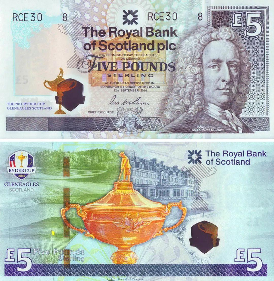 2014年9月22日,为庆祝“莱德杯”赛举行,苏格兰特发行此版纪念钞。其正面为苏格兰皇家银行首任总裁艾莱勋爵,背面是莱德杯、比赛的举办地格伦伊格尔斯酒店和高尔夫球场第9洞的风景。此钞是第一张混合纸(传统棉布和高分子聚合物结合)为基材印刷的欧洲钞票。