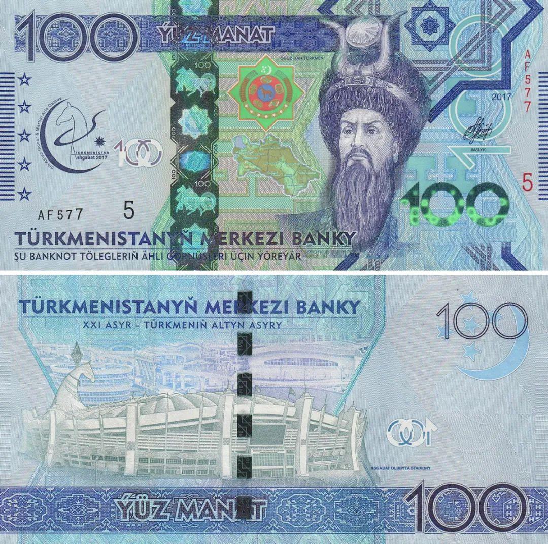 亚洲室内运动会和亚洲武道运动会原是两个独立的运动会,亚奥理事会第28届代表大会于2009年7月3日决定,将两个运动会合并为亚洲室内与武道运动会,每4年举办一届,是亚洲地区规模最大的综合性室内运动会。 2017年9月17至27日,第五届亚洲室内与武道运动会在土库曼斯坦首都阿什哈巴德举行。土库曼斯坦于9月27日发行了一套6张的纪念钞,面额分别为1、5、10、20、50和100马纳特,正面是土库曼历史人物,背面是土库曼的标志建筑。100马纳特正面主景为突厥神话中的突厥可汗乌古斯。据传,这位蓄着长须、头戴牛角帽的男子,是土耳其主义的开创者苏雷曼根据中国史料杜撰的,被认为是白登之战中打败汉高祖刘邦的匈奴冒顿单于。背面主景是位于阿什哈巴德的奥林匹克体育场。运动会的会徽为土库曼斯坦国宝阿哈尔捷金马,中国称汗血宝马,它也被设计在国徽的正中。