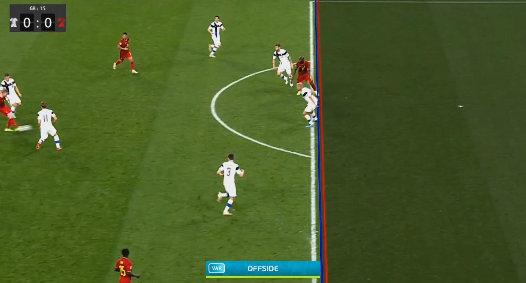 第64分钟,比利时反击,德布劳内中路送出精准直塞,卢卡库侧身接球后转身左脚打门球进,VAR回放卢卡库越位了。↓