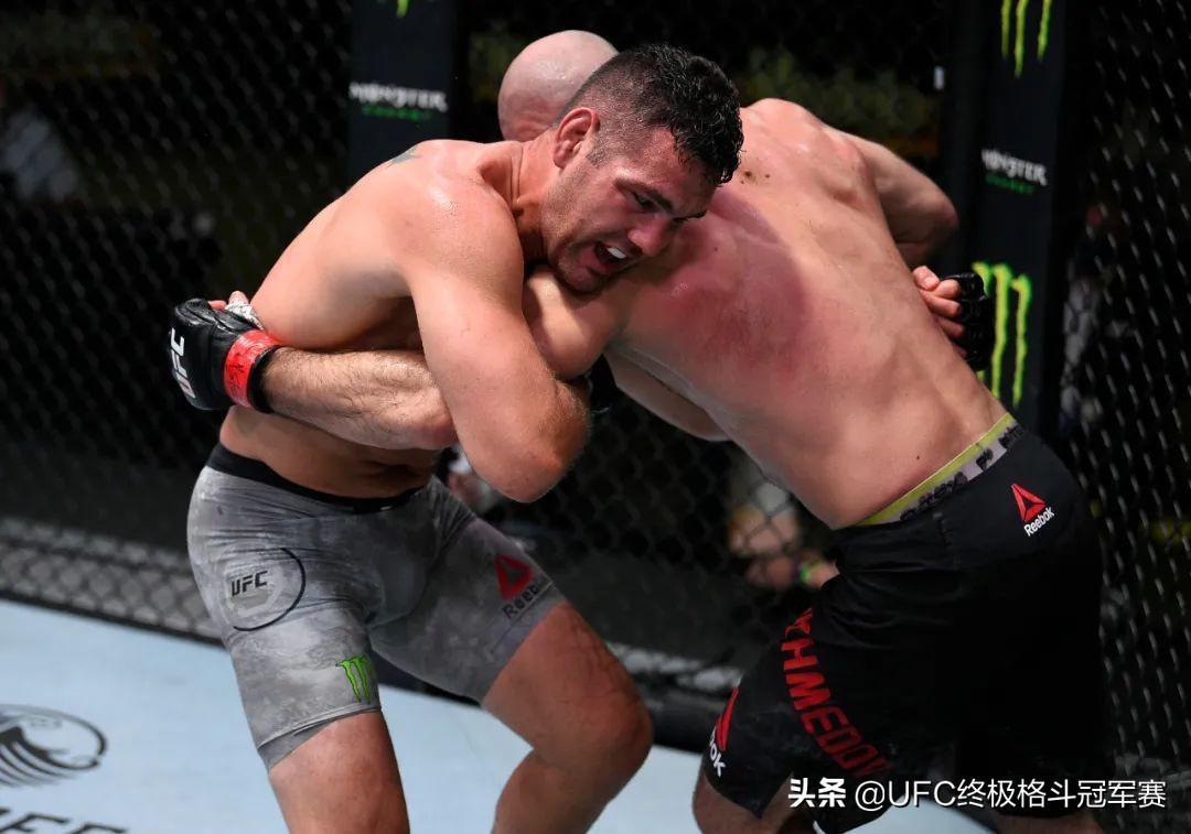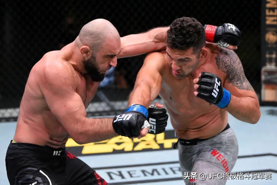 魏德曼在轻重量级败给雷耶斯后,重回中量级,迎接他的是处于三连胜的阿克梅多夫。他清楚自己的优势在于摔跤缠斗,因此一上来就发动抱摔。然而,阿克梅多夫绝非软柿子,他在首回合的防摔相当不错,数次完成逃脱,即便被摔倒也能很快起身,魏德曼打得并不容易。