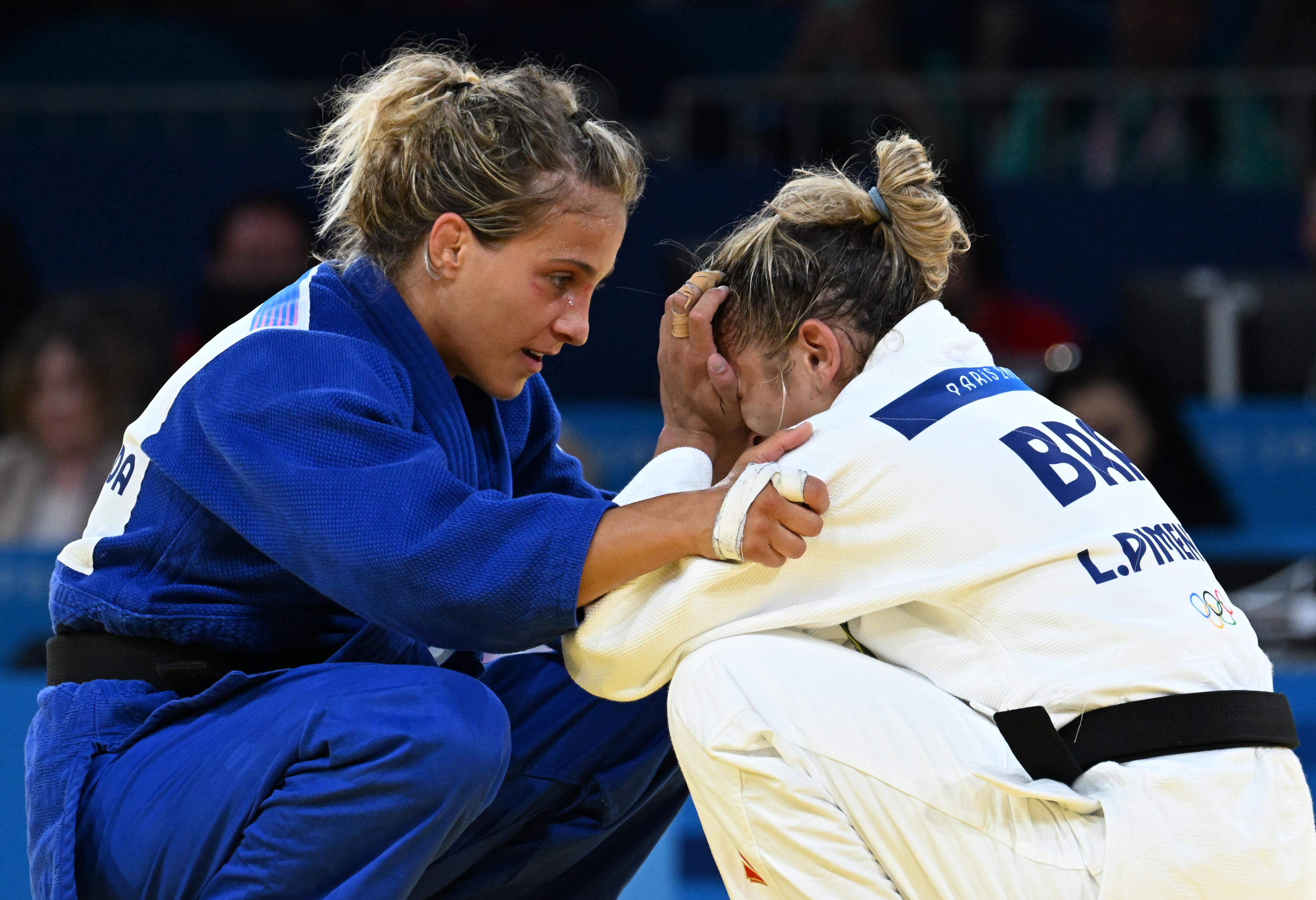 7月28日,意大利选手朱弗里达(左)和巴西选手皮门塔在赛后交流。 新华社记者 李安 摄
