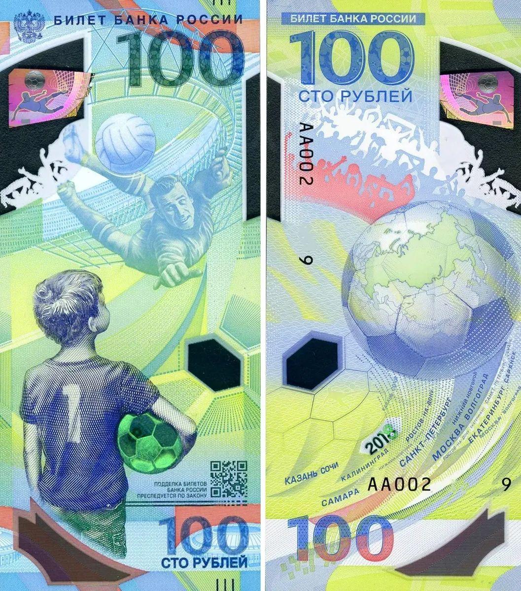 2018年版100俄罗斯卢布票幅:150×65mm 第21届国际足联世界杯于2018年6月14日至7月15日在俄罗斯11个城市举行。这是世界杯首次在俄罗斯举行,亦是首次在东欧国家举行,同时也是继2006年德国世界杯后该赛事再次重返欧洲,被国际足协主席因凡蒂诺称为“史上最好之一”的世界杯。最终,法国队时隔20年再捧大力神杯,克罗地亚队收获历史最好成绩——亚军。东道主俄罗斯队挺进8强,虽未夺冠,但已创造苏联解体后俄罗斯足球最好成绩。俄罗斯在足球之外,更是收获满满:成功利用本届世界杯赛促进了自身经济及旅游业的发展,让全世界改变了对它的印象,还为其彼时的外交困境打开新局面。 2018年版世界杯纪念钞是俄罗斯自主研发的第一枚聚合物塑料钞,也是俄罗斯联邦成立后发行的第三枚纪念钞,还是世界上第四枚印有二维码的纪念钞。其色彩丰富、柔和自然,现代感、动感突出,正背面图案均采用竖版设计。正面表现足球精神的传承:俄罗斯男孩胳膊下夹着足球,梦想成为像20世纪俄罗斯最佳守门员列夫·雅辛一样伟大的球员,既展现了俄罗斯优秀足球运动员的风采,又表现了年轻一代对足球明星的钦佩;既回顾了过去的辉煌,又反映了对未来的憧憬。画面一远一近、一动一静,颜色一深一浅、一实一虚,包涵多重深刻内涵。背面主景是一个飞翔的足球,与地球影像叠加,完整展示俄罗斯版图。足球图案上方以俄罗斯国旗三色勾勒出球迷欢呼呐喊的剪影,下方则列出此次世界杯的11座举办城市的名字,是正面内容的延伸、补充和呼应。巨大的足球(地球)是设计亮点之一,它将足球和地球有机结合,阐述了一个观点:本届世界杯既是俄罗斯举办的体育赛事,也是世界球迷的狂欢。 从技术角度看,此版纪念钞比一般钞票具有更多的防伪技术,不仅引入全息图像、二代光彩光变等先进技术,还特别引入二维码(QR-code)链接,扫描后即可访问俄央行官网。当然,也有一些批评意见,如正面小男孩像雕刻粗糙、线条生硬、手感较弱,裁切不平整;背面采用的黄色稍显廉价感,等等。