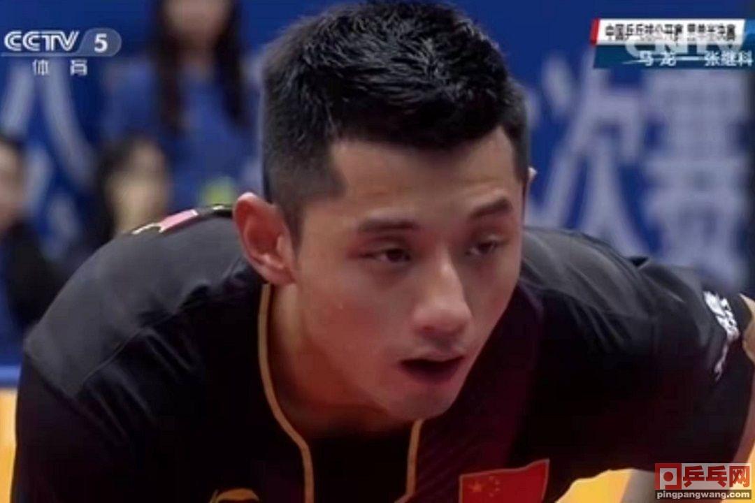 大岛祐哉发球,张继科摆短,大岛祐哉再摆冒高,张继科正手暴扣,10-7拿到赛点。