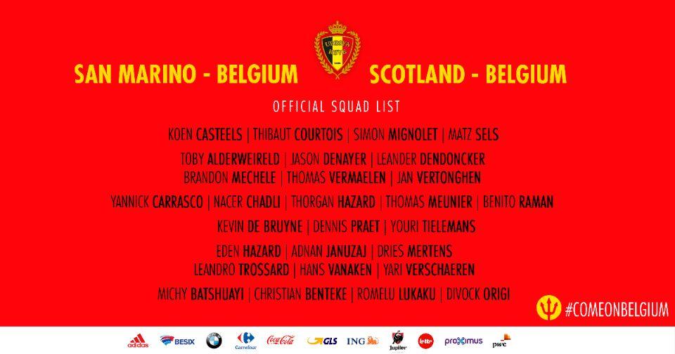直播吧8月30日讯 为了迎接即将到来的对阵圣马力诺及苏格兰的欧预赛,比利时国家队公布了新一期的大名单,阿扎尔、德布劳内领衔,卡拉斯科在列。
