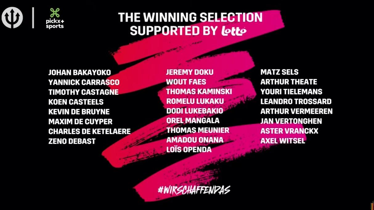 前锋:杰雷米-多库(安德莱赫特)、阿扎尔(皇家马德里)、默滕斯(那不勒斯)、奥里吉(利物浦)、特罗萨德(布莱顿)、卢卡库(国际米兰)、迪马塔(安德莱赫特)