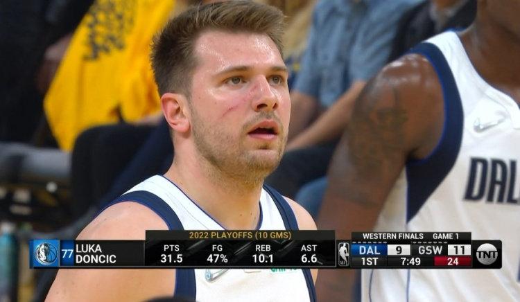 整个上半场东契奇12投5中,得到18分4篮板2助攻1抢断。上半场的一次罚球,东契奇的脸上更是出现了一道血痕……