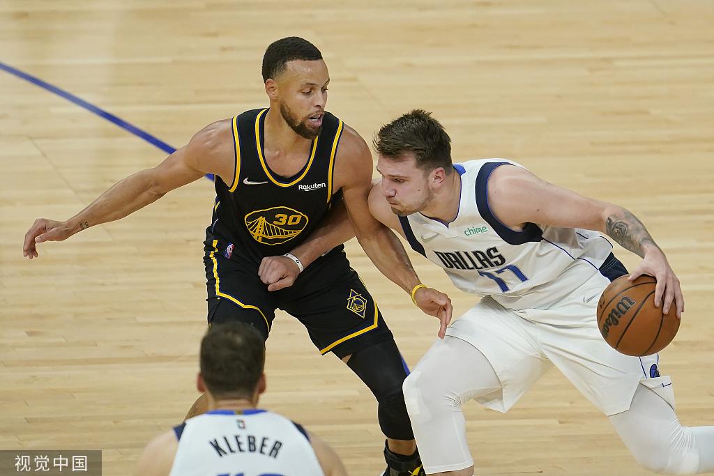 库里(左)防守东契奇。