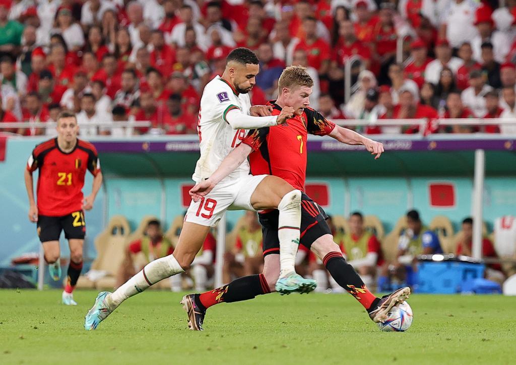 11月27日,比利时队球员德布劳内(右)与摩洛哥队球员恩内斯里拼抢。新华社记者 王东震 摄