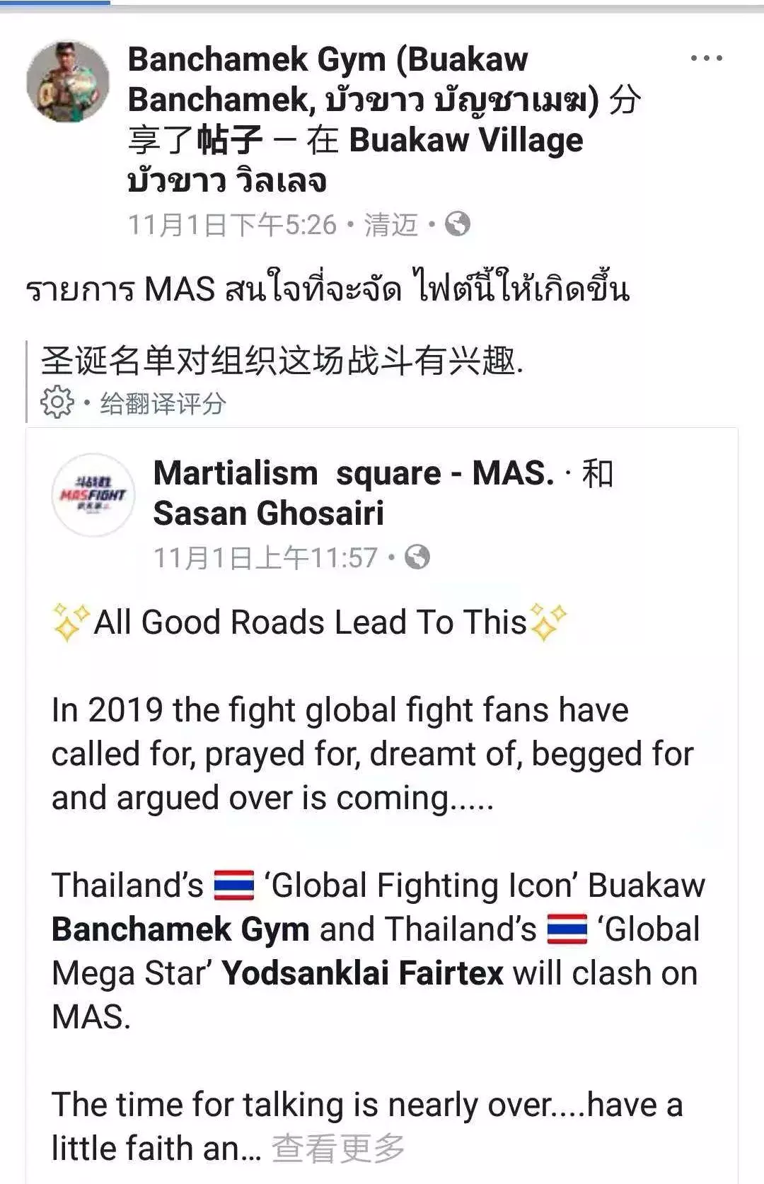 昨日,MASFIGHT赛事在外国社交平台发布消息称,2019年播求和雅桑克莱两位泰拳传奇将在MASFIGHT的比赛中开战,播求本人也在自己的社交平台上对这条信息进行了转发。