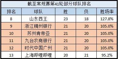 常规赛第41轮结束后,浙江稠州银行、苏州肯帝亚、九台农商银行、时代中国广州4支球队均取得了21胜20负,胜场率相同。