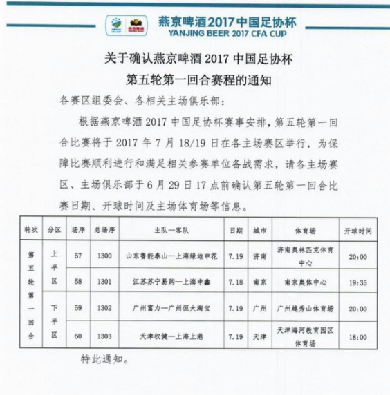 其中,苏宁和申鑫的比赛被安排在7月18日的19:35开球,其余3场首回合较量均是19日开球,鲁能VS申花,富力和恒大的广州德比,均是20:00开球,权健和上港的新贵对决18:00开球。