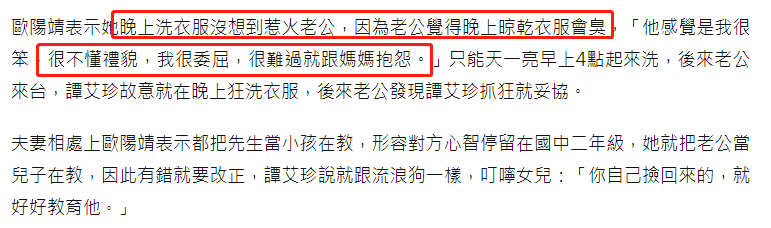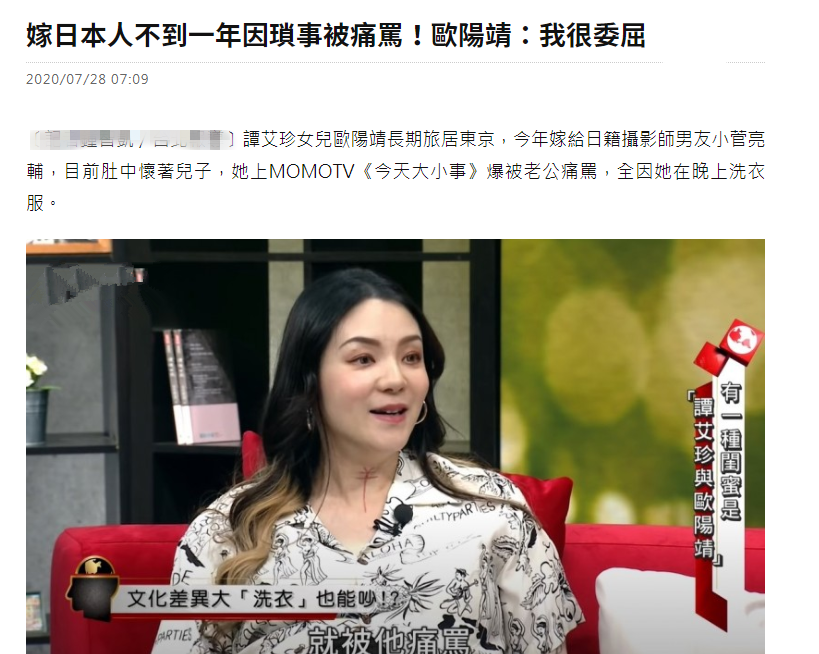 7月28日,根据台媒的报道,36岁女星欧阳靖和妈妈谭艾珍上综艺节目《今天大小事》做嘉宾。节目中欧阳靖大吐苦水,自曝经常因琐事与日本老公争吵,还试过因她在晚上洗衣服而被男方痛骂。