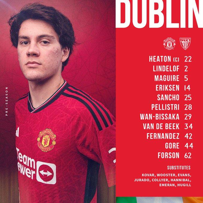 曼联首发:22-希顿(C)、29-万比萨卡、5-马奎尔、2-林德洛夫、42-A-费尔南德斯、44-戈尔、14-埃里克森、28-佩利斯特里、34-范德贝克、62-福森、25桑乔