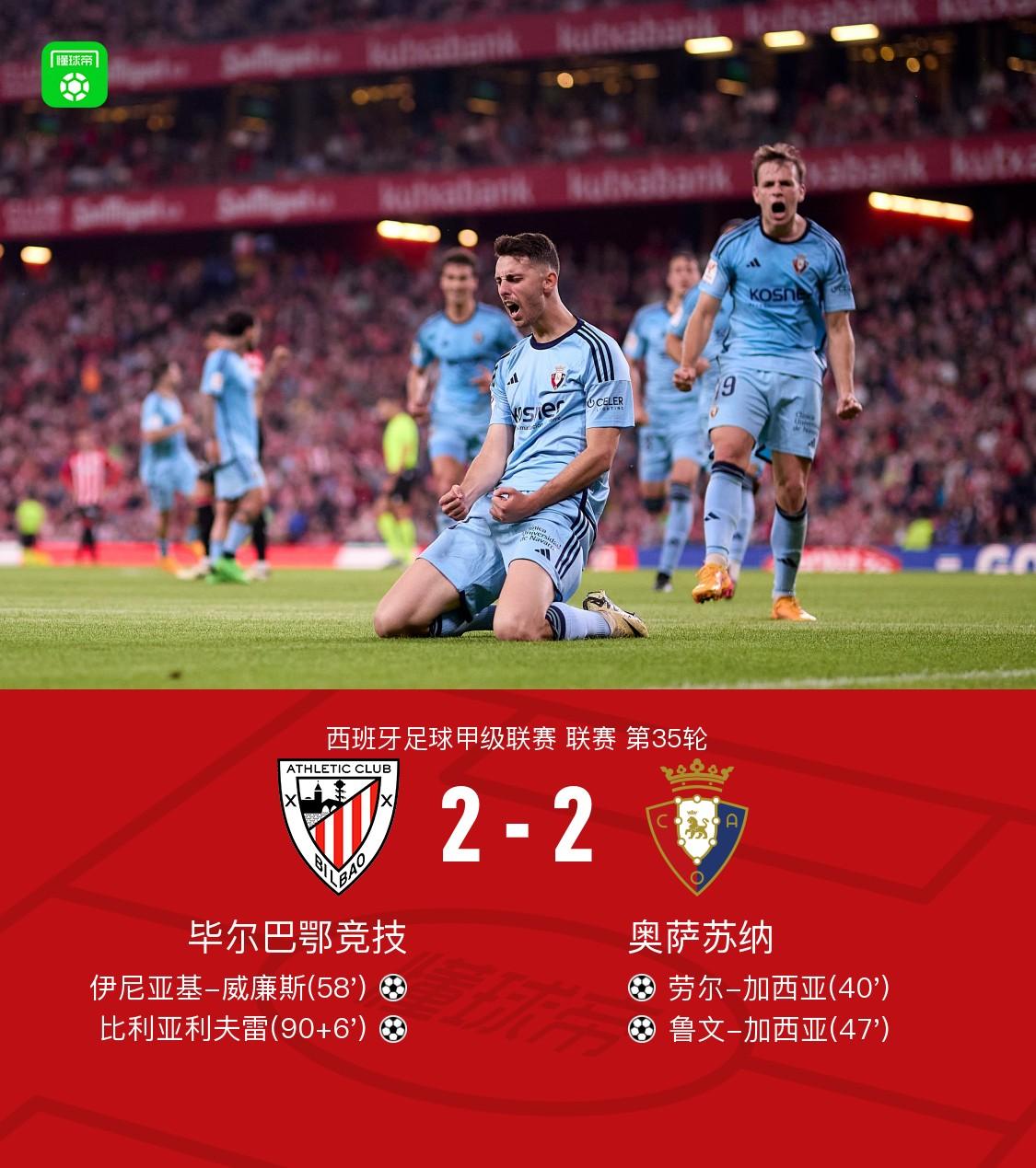 在5月12日的西班牙足球甲级联赛第35轮比赛中,毕尔巴鄂竞技与奥萨苏纳展开了激烈的对决。上半场,劳尔-加西亚破门。下半场,鲁文-加西亚单刀冷静推射扩大领先优势。随后,伊尼亚基-威廉斯爆射扳回一城。读秒阶段,奥萨苏纳门将失误,比利亚利夫雷捡漏绝平。全场比赛结束,毕尔巴鄂2-2战平奥萨苏纳。