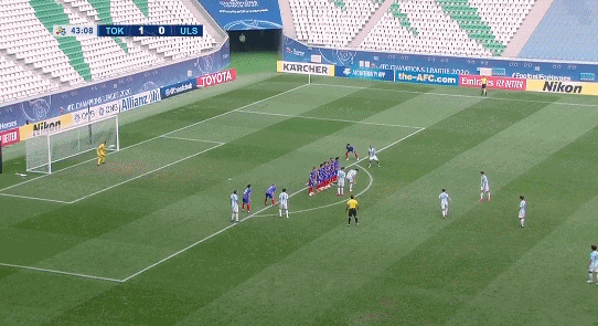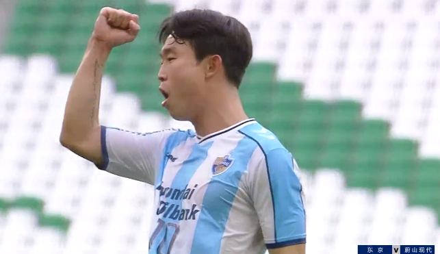 第44分钟,尹比加兰主罚任意球命中,蔚山现代在半场结束前扳平1-1;